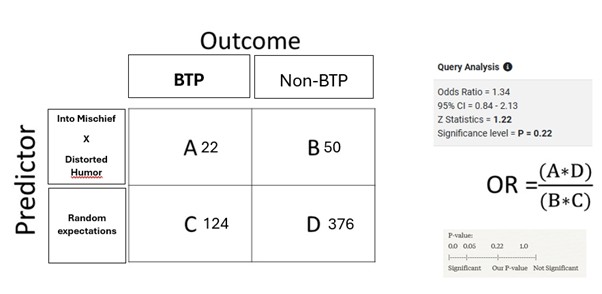 Our examination of the direct Into Mischief x Distorted Humor cross reveals 72 racing-age offspring, producing 22 Black Type Performers, including G1 winners Life Is Good and Practical Joke. The 30.6% success rate appears impressive, yet statistical analysis tells a more nuanced story. Compared to a random sample of similarly bred horses – accounting for the quality level of both sire and dam – this pattern shows an Odds Ratio of 1.34. While this suggests horses bred on this pattern are 34% more likely to achieve black-type performance than expected given their breeding, two critical statistical measures indicate this could be random chance. The confidence interval of 0.84-2.13 crossing 1.0 means we cannot rule out that there’s no effect at all, while the P-value of 0.22 indicates a 22% probability these results occurred by chance – well above the conventional 5% threshold for statistical significance.